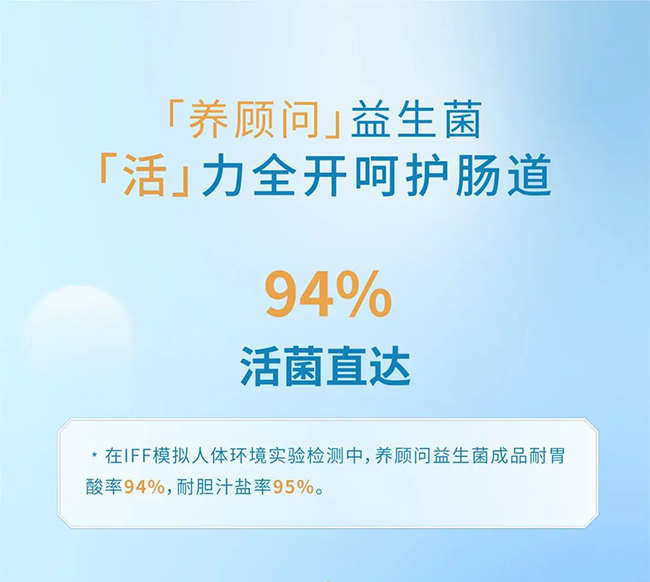 經過測試,采用超低溫凍干技術的養顧問益生菌,在胃液中的存活率高達94%,在膽汁鹽中的存活率更是達到了95%,這樣的成績單,讓高活性、高穩定、高定殖成為現實。這兩項亮眼的數據,也為益生菌行業樹立了新的標桿。